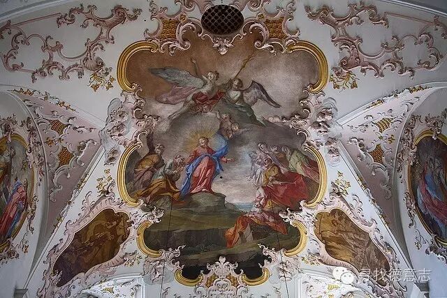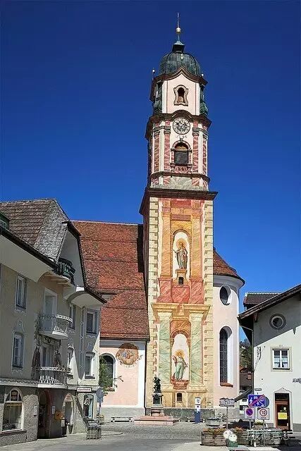 米腾瓦尔德的这些绘画诞生于1746年,它的创作者是教堂画师马特乌斯·君特。而教堂内部以及尖塔的绘画则是君特的老师阿萨姆所作。这种被称为室外画的艺术源自意大利的巴洛克风格,画师们使用的是一种叫做"湿壁画"的工艺。他们用水溶性的矿石颜料,在刚刚刷涂好灰泥泥浆,还没有干透的外墙上作画,随着泥浆的干燥和固定,这些颜料已经深深渗入其中。这样,一幅不怕风吹日晒,能经风雨洗礼的壁画就诞生了。