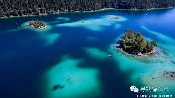 阿尔卑斯上德国一侧的楚格峰脚下,海拔一千米处就是巴伐利亚景色宜人的艾布湖。艾布(Eiben)是德语红豆杉的意思,因为湖畔四周曾经长满了红豆杉。湖面上点缀着八个小岛,湖水清澈见底。艾布湖四周蜿蜒的林间小道供游客漫步或骑车探险。